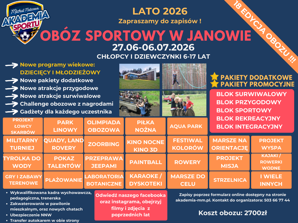 Już teraz zapraszamy na kolejną 18 edycję obozu sportowo surwiwalowego, który podobnie jak w poprzednich latach odbędzie się na początku wakacji, w dobrze wszystkim znanym Janowie Lubelskim.